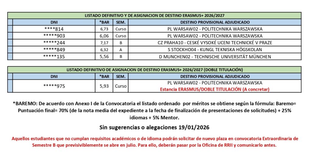 Listado DEFINITIVO de adjudicación de destinos Erasmus para el curso 2026-2027