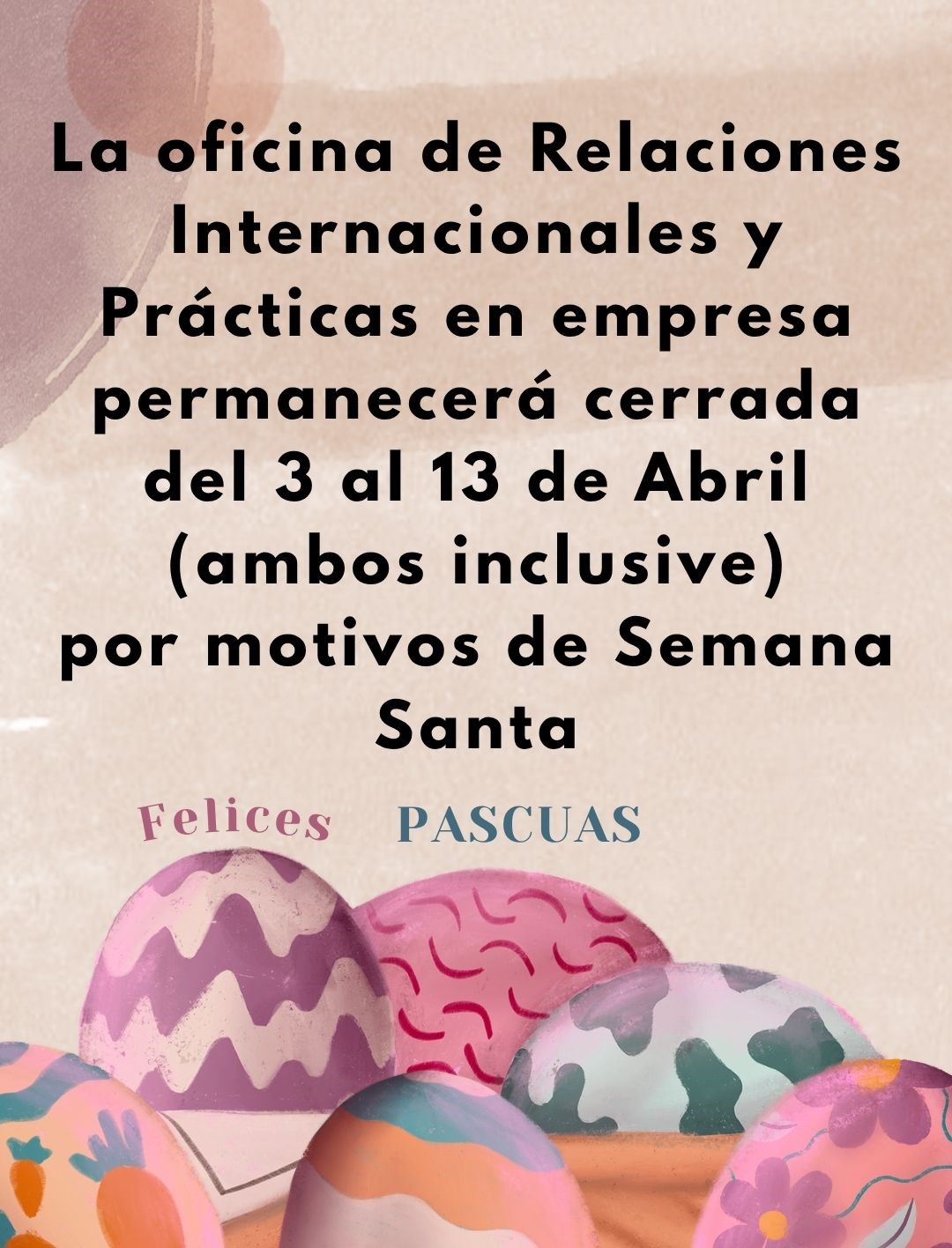 La oficina de RRII permanecerá cerrada por motivos de Semana Santa del 3 al 13 de Abril, ambos inclusive.